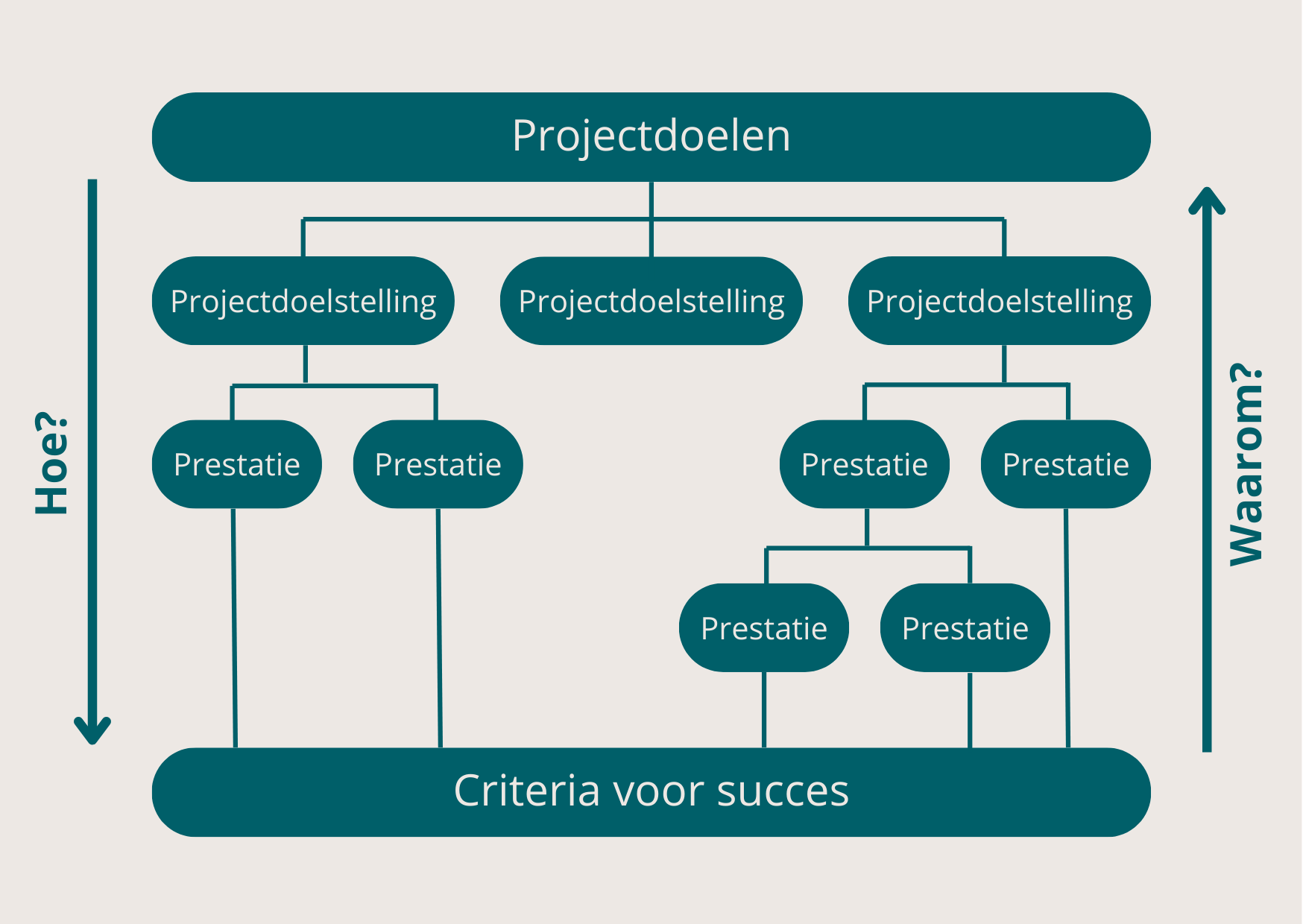 Bepaal nu met het team de projectdoelstellingen en prestaties. Maak hierbij gebruik van onderstaande hiërarchie van doelstellingen. Werk van boven naar beneden door de vraag te stellen “hoe?” gaan we de doelen en doelstellingen realiseren. En ga van beneden naar boven en stel de vraag “waarom?” om de doelen en doelstellingen beter te formuleren. Herhaal dit eventueel voor het beste resultaat.
